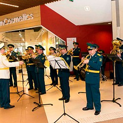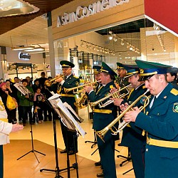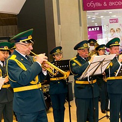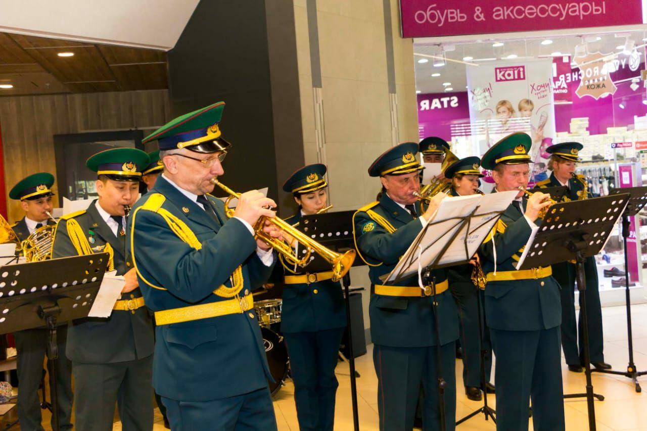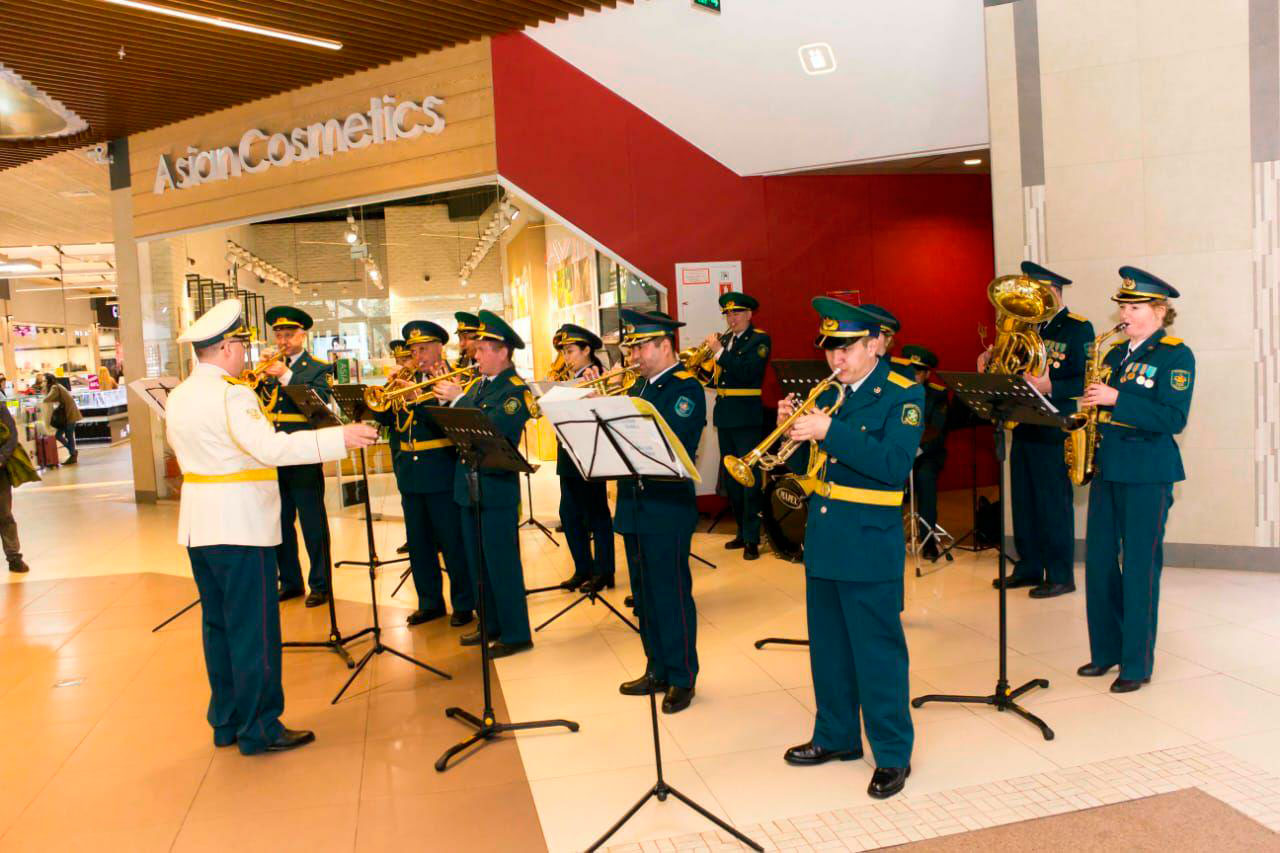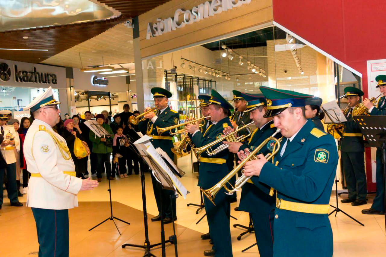 Музыкальный флешмоб устроил сводный военный оркестр Военно-инженерного института радиоэлектроники и связи Министерства обороны РК и Академии Пограничной службы КНБ РК для жителей и гостей г. Алматы в одном из городских торгово-развлекательных комплексов.