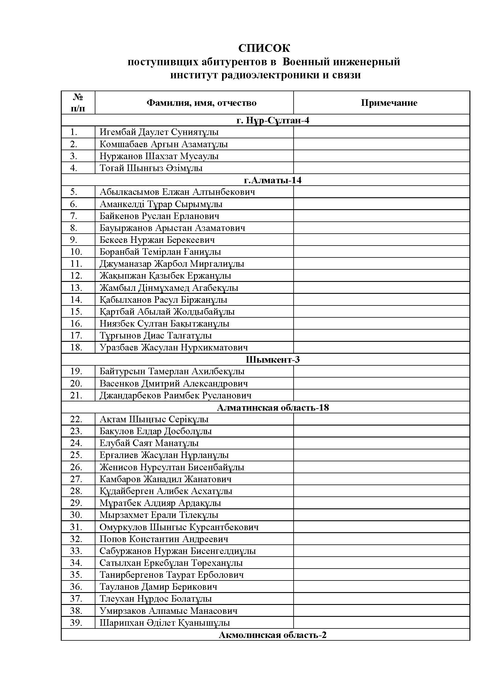 Скачать Список поступивших абитуриентов в Военно-инженерный институт радиоэлектроники и связи МО РК