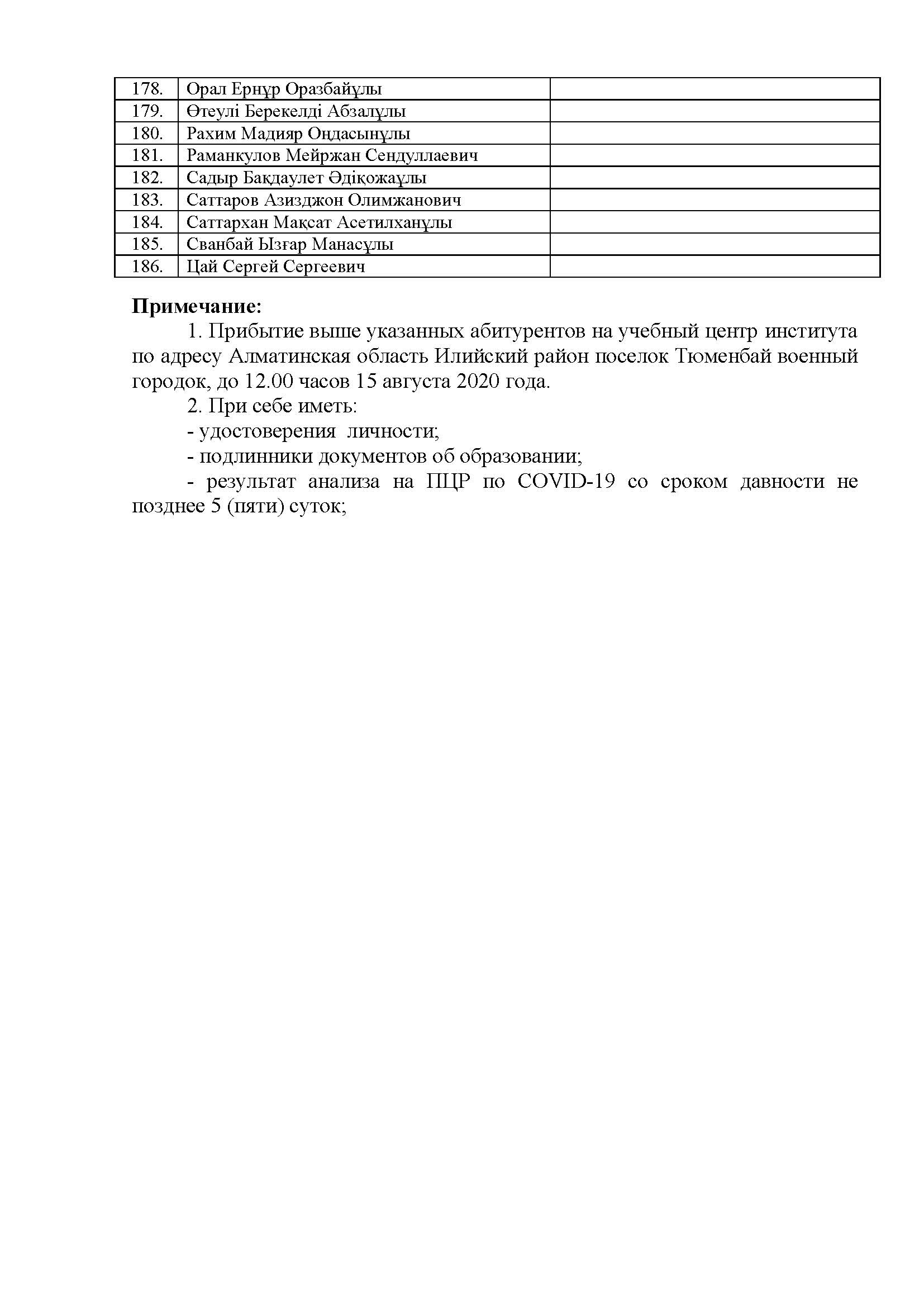 1. Прибытие выше указанных абитурентов на учебный центр института по адресу Алматинская область Илийский район поселок Тюменбай военный городок, до 12.00 часов 15 августа 2020 года.