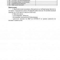 1. Прибытие выше указанных абитурентов на учебный центр института по адресу Алматинская область Илийский район поселок Тюменбай военный городок, до 12.00 часов 15 августа 2020 года.